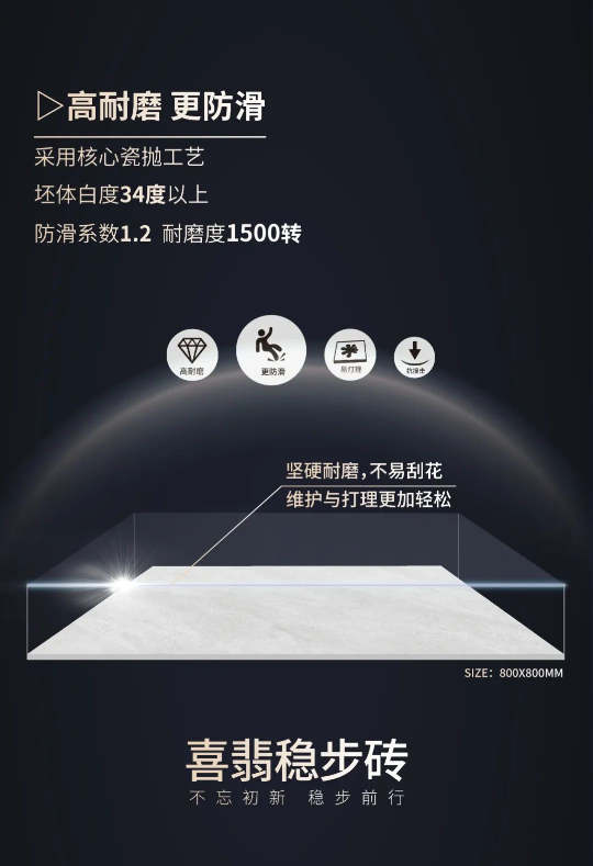 自主研發高耐磨釉料配方,防滑系數1.2,耐磨度1500轉,堅硬耐磨,不易刮花,給家更長久的守護。
